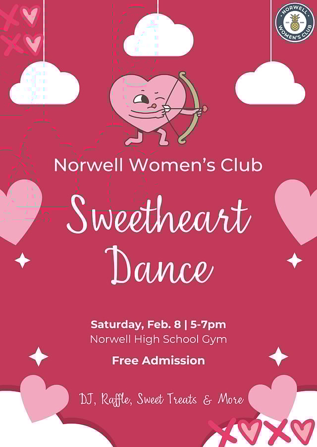 Celebrate love and community at the Norwell Women’s Club’s Valentine’s Day Dance on Saturday, February 8, 2025, from 5:00 PM to 7:00 PM at Norwell High School, 18 South Street, Norwell.