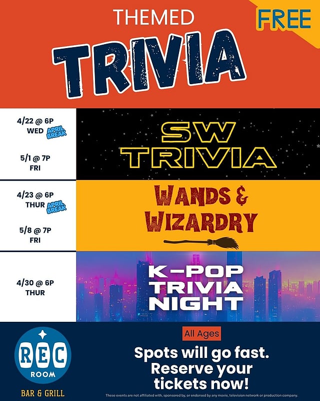 π FREE Themed Trivia at our Bar & Grill, The Rec Room! π§ β¨ Come test your knowledge and have some fun with us!