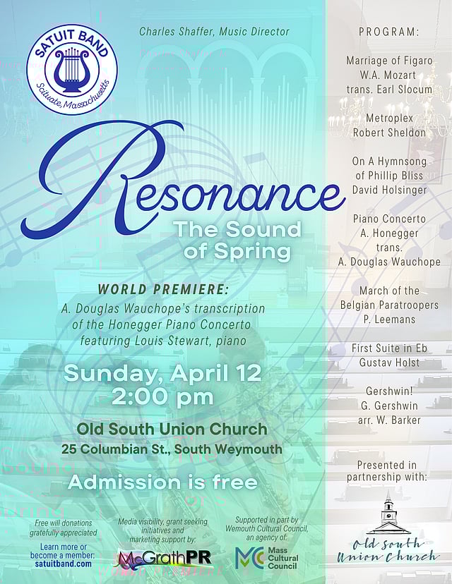 A. Douglas Wauchope, Conductor Emeritus of the Satuit Band, and transcription composer for the premiere work, is celebrated for his long and distinguished service to the ensemble. A seasoned trombonist and educator with tenures with institutions including South Shore Conservatory, New England Conservatory and Berklee College of Music, Wauchope has been a fixture in the South Shore music scene for decades. Arthur Honegger (1892–1955), the Swiss-born composer of the original “Concertino for Piano and Orchestra H.55,” was a member of the influential group Les Six. His music is known for its dynamic rhythms, poignant counterpoint, and richly expressive harmonic language — elements that come vibrantly to life in this new band transcription. “Resonance: The Sound of Spring” is supported in part by a grant from Weymouth Cultural Council, a local agency supported by Mass Cultural Council, a state agency. All are welcome to this afternoon of superb community music-making and a rare opportunity to hear a new work unveiled by one of the region’s most beloved musical ensembles.