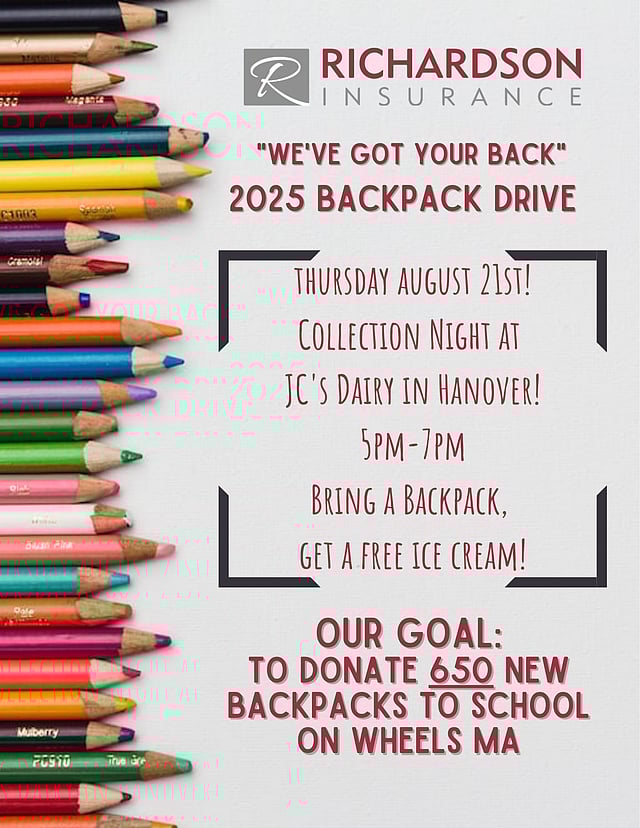 The "We've Got Your Back" Backpack Drive is officially underway at Richardson Insurance! For each of the past 8 years we have collected backpacks to donate to School on Wheels of Massachusetts. This inspiring organization supports local children facing homelessness right in our own neighborhoods. We think everyone should start the school year with their head held high, and a new backpack to show off to their friends! Our drive will run through the end of August, and this year we have set an ambitious goal of 650 backpacks to make a small impact in our community. Please join us August 21, 2025 from 5-7pm at JC's Dairy in Hanover to drop off a backpack, say "hello" and enjoy an ice cream on us!!