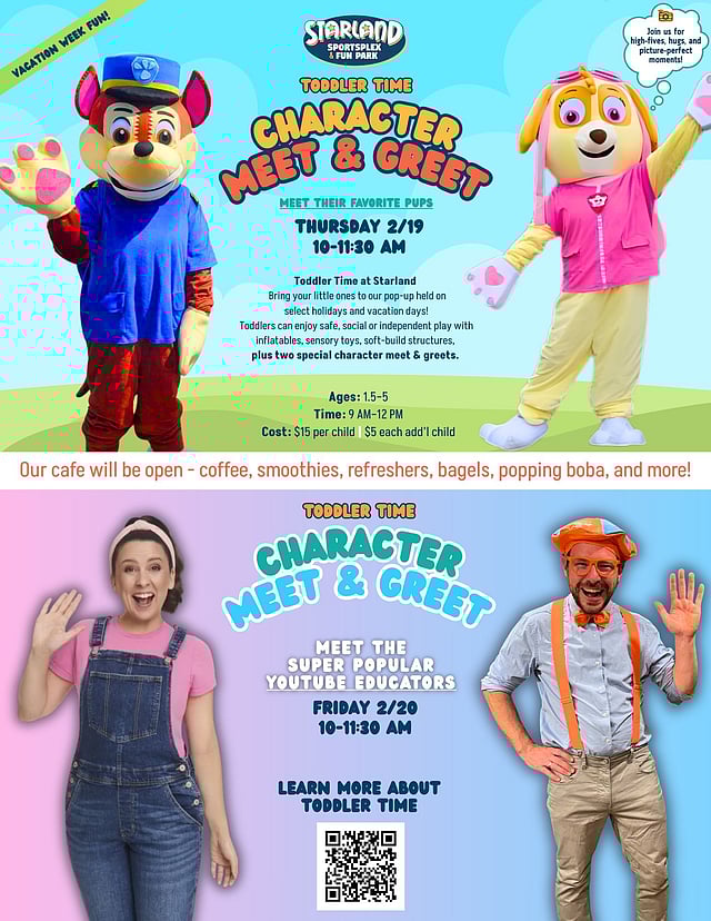 Toddler TV Favorites–Inspired Meet & Greet 🐶 Toddler Time at Starland is back with a special Character Meet & Greet—at no extra cost! Bring your little ones to meet their favorite pups while they enjoy safe, age-appropriate fun. 📅 Thursday 2/19 | ⏰ 9–12 PM 👶 Ages 1.5–5 | 💲 $15 per child | $5 each additional child Inflatables, sensory play, soft-build structures, and plenty of smiles guaranteed 💛 Visit our website for more details: https://starlandsports.com/sportsplex/preschool-programs
