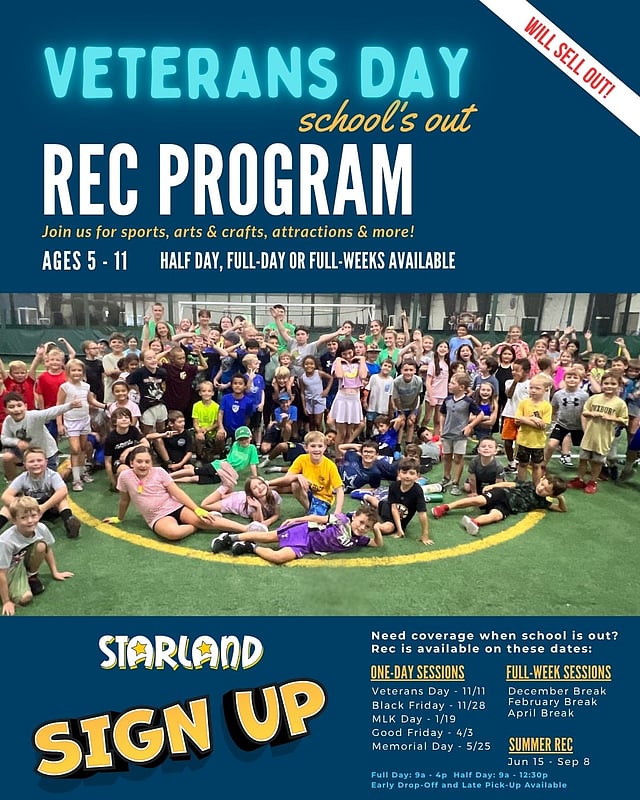 School may be closed, but Starland is wide open for a full day of fun! ⭐ Activities may include: sports, laser tag, bumper cars, arts & crafts…and even a few surprises! 🍕 Lunch is included with both half-day and full-day registration. 📍 Who: Boys & Girls, Ages 5–11 📅 When: Tuesday, November 11th, 2025 🕑Time Full Day: 9:00a–4:00p, $85 Half Day: 9:00a–12:30p, $60 Early Drop-Off & Late Pick-Up available with an additional $15 👉Don’t wait! Register NOW https://starlandsports.com/rec-program