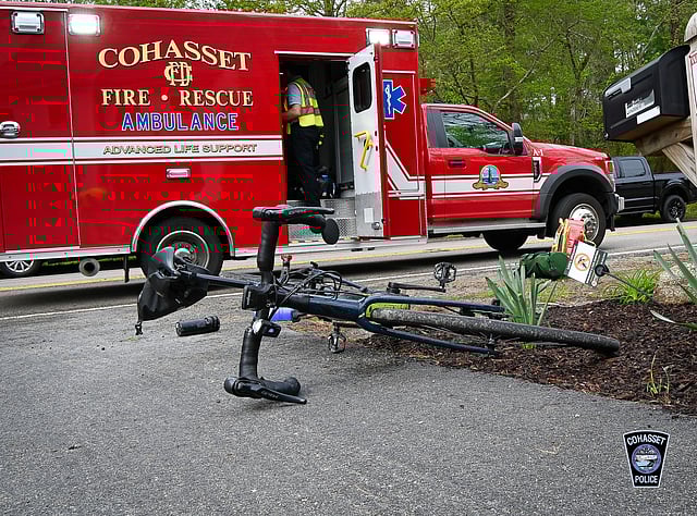 Cohasset Police responded to the area between Pond Street and Mendel Road around noon for a report of a bicyclist hit by a car. When officers arrived, they found the man on the ground, receiving aid from passing motorists.