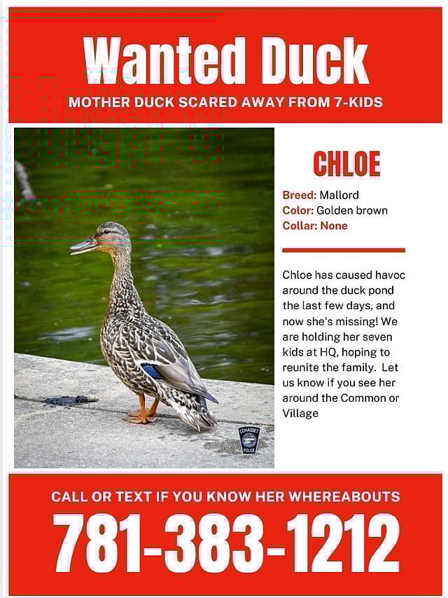 The ducklings are now safe and temporarily in the care of Natural Resource Officer Josh Kimball, who has them at the Cohasset Police Department. Kimball plans to return to the Common this afternoon to try to locate Chloe and reunite the family.